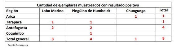 “A la fecha tenemos un chungungo que dio positivo en Arica, un lobo marino y un pingüino en Tarapacá. Dos lobos marinos y dos pingüinos en Antofagasta, y ahora un pingüino en Coquimbo. En total 8 casos confirmados positivos de un total de 137 muestras tomadas a ejemplares mamíferos marinos y pingüinos en el país”, confirmó el Subdirector Nacional de Sernapesca.