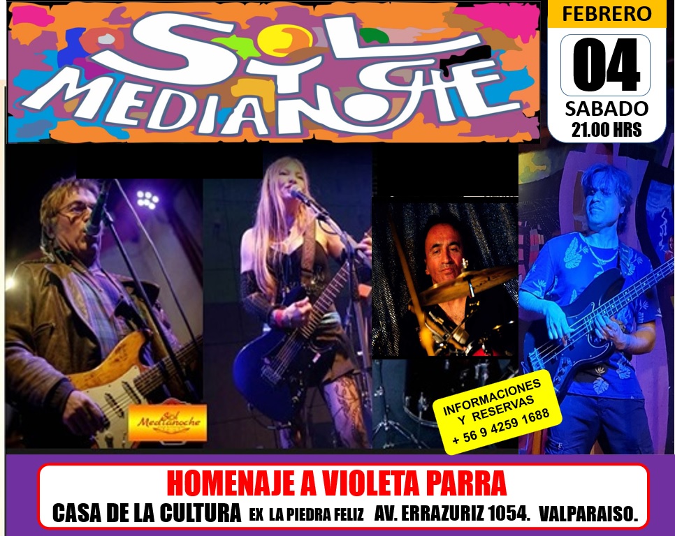 Sol y Medianoche está de regreso con una nueva formación dirigida por el fundador original del grupo Jorge Soto y dispuestos a recuperar el terreno perdido recorriendo nuevamente el país que también está renovado como ellos. El concierto de este sábado 04 de febrero a las 21.00 hrs, de homenaje a Violeta Parra en el local La Casa de la Cultura ex La Piedra Feliz de Av. Errazuriz 1054, recibirá el regreso en Valparaíso de la histórica banda chilena. Informaciones y reservas se pueden obtener al WhatsApp + 56 9 4259 1688.