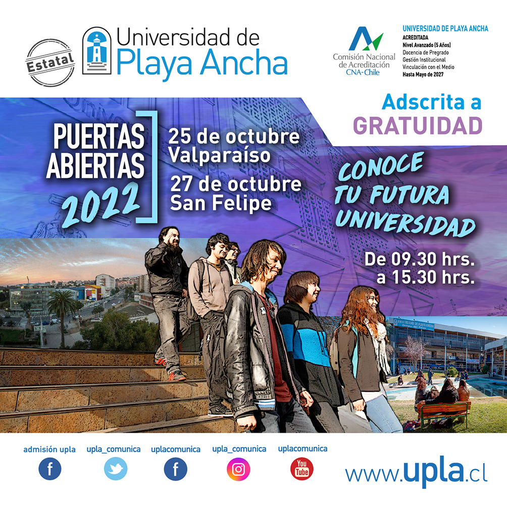 Con una oferta académica conformada por 41 carreras profesionales y 8 carreras de formación técnica, la Universidad de Playa Ancha (UPLA) retoma el tradicional día de “Puertas Abiertas”, para que estudiantes de enseñanza media, egresados y futuros postulantes recorran la casa de estudios y conozcan sus facultades, así como sus programas de acceso y apoyo para el proceso de Admisión 2023.