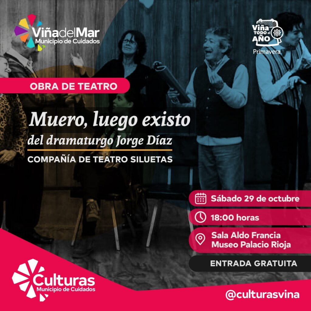 El Departamento de Cultura del Municipio de Cuidados de Viña del Mar invita a la comunidad a ver la obra “Muero, luego existo” del destacado dramaturgo nacional Jorge Díaz el sábado 29 de octubre, a las 18:00 horas, en la Sala Aldo Francia del Museo Palacio Rioja (Quillota 214).