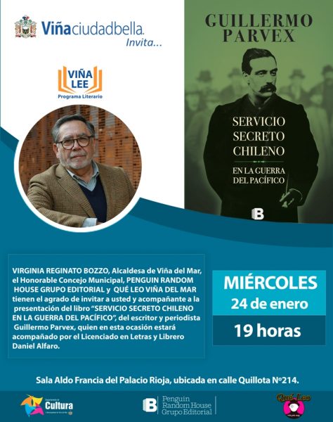 Que Chile haya contado con un grupo de agentes que logró boicotear la compra de naves bélicas, anuló el envío de armamento y se infiltró en diversos lugares y niveles, obteniendo información que el Gobierno de Chile requería mientras se enfrentaba a Perú y Bolivia entre 1879 y 1883. Estos no son los componentes de la trama de una novela de ficción, sino que el resultado de la exhaustiva investigación histórica que Guillermo Parvex abordó y plasmó en su libro “Servicio secreto chileno en la Guerra del Pacífico”; que el ciclo “Viña Lee” presentará el miércoles 24 de enero.