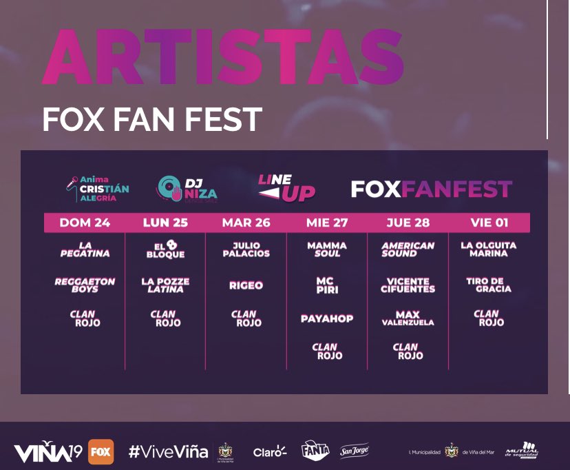 Dentro del line up de bandas y humoristas confirmados, el evento contará con el siguiente programa: Domingo 24 de febrero: la pegatina, Reggaeton Boys y Clan Rojo; lunes 25: El Bloque 8, la Pozze latina y Clan Rojo; martes 26: Julio Palacios, Rigeo y Clan Rojo; miércoles 27, Mamma Soul, Mc Piri, Payahop y Clan Rojo; jueves 28: American Sound, Vicente Cifuentes, Max Valenzuela y Clan Rojo y el viernes 1 de marzo: La Olguita Marina, Tiro de Gracia y Clan Rojo.
