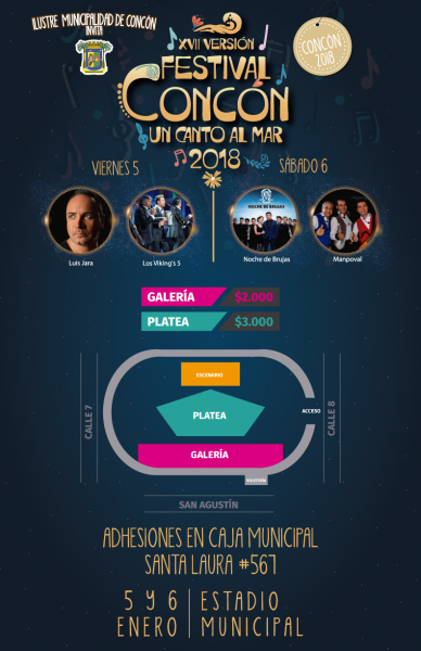 El próximo 5 y 6 de enero se llevará a cabo la XVII versión del Festival Concón un Canto al Mar, convirtiéndose en el primer certamen en realizarse en el país durante el 2018 y el punta pie inicial a una serie de actividades recreativas organizadas por el municipio.