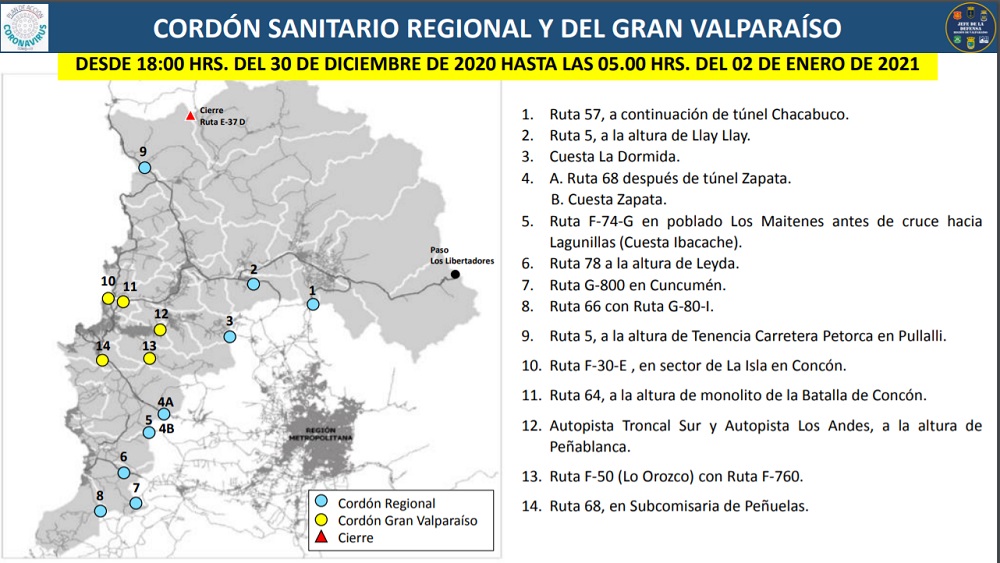 A las 18 horas de hoy 30 de diciembre se inició los controles y cordones sanitarios en gran parte de la región de Valparaíso, para prevenir posibles contagios del COVID-19 y lograr que nadie salga desde la región Metropolitana.