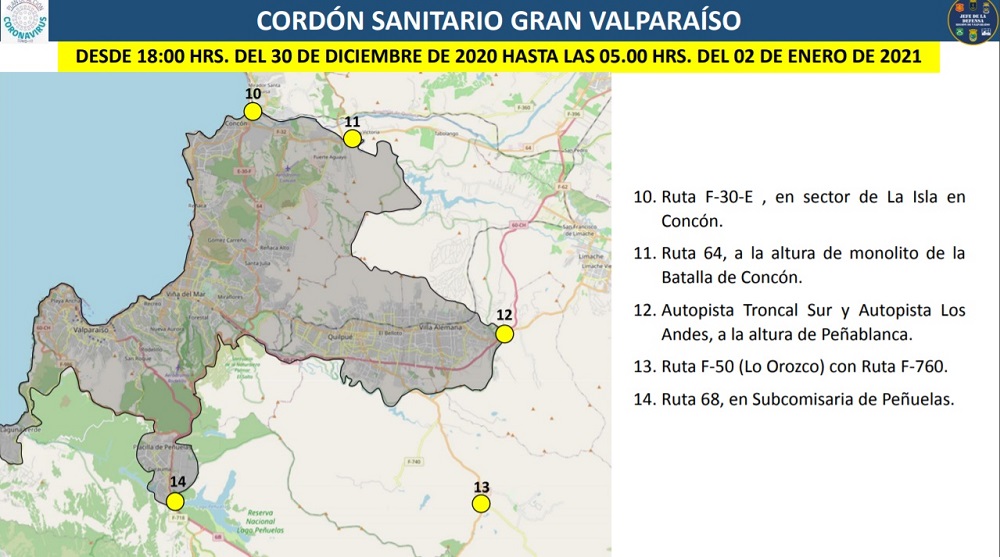 También habilitaron cordones sanitarios en el Gran Valparaíso en las comunas de Valparaíso, Viña del Mar, Quilpue y Villa Alemana, especialmente en las entradas y salidas principales de las comunas mencionadas.